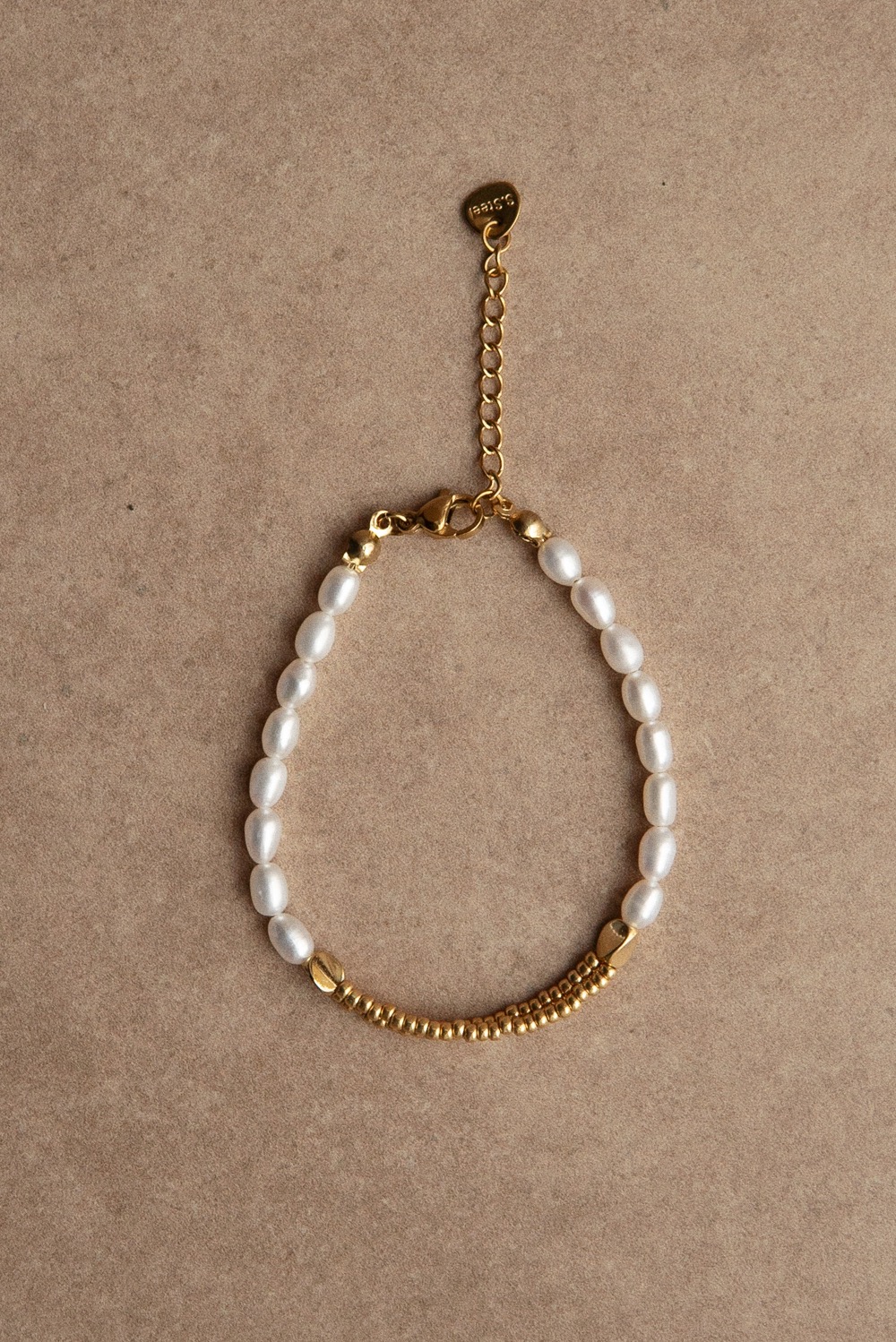 Выполнено из ювелирного тросика, на который нанизаны золотистый бисер. Дополняют браслет жемчужные бусины.