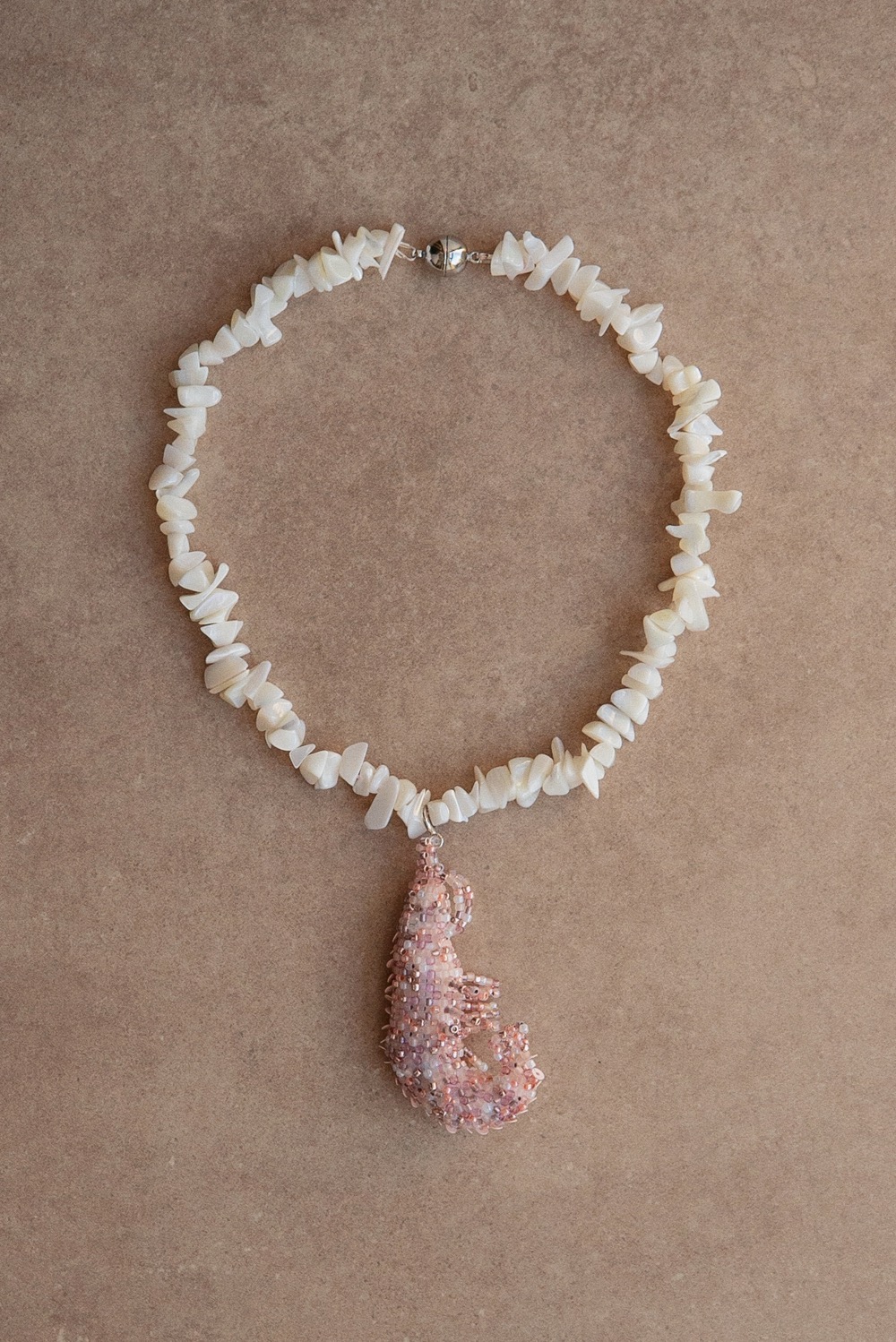 Ожерелье Креветка — сплетенная вручную розовая креветка из японского бисера, украшенная пайетками, на ожерелье из перламутра.